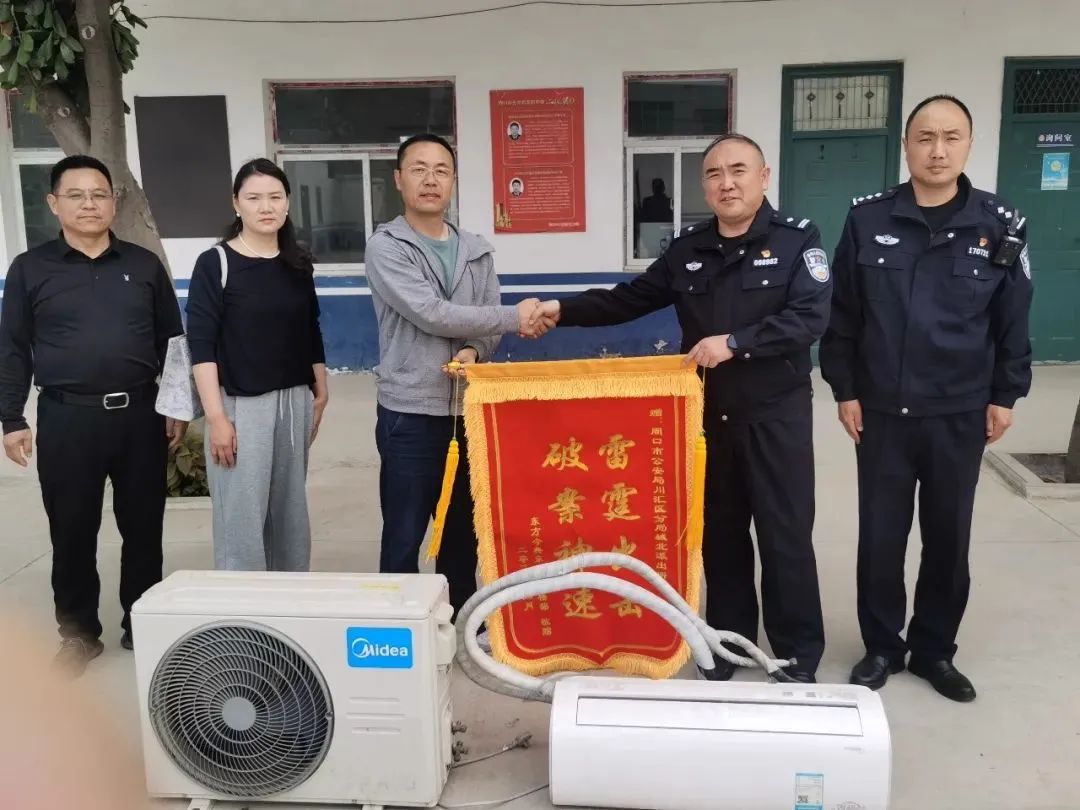 4月18日上午,川汇区某小区项目部负责人来到川汇区公安分局城北派出所将一面绣有“雷霆出击、破案神速”的锦旗送到民警手中,感谢他们快破案、快追赃,成功帮他们追回被盗的空调。