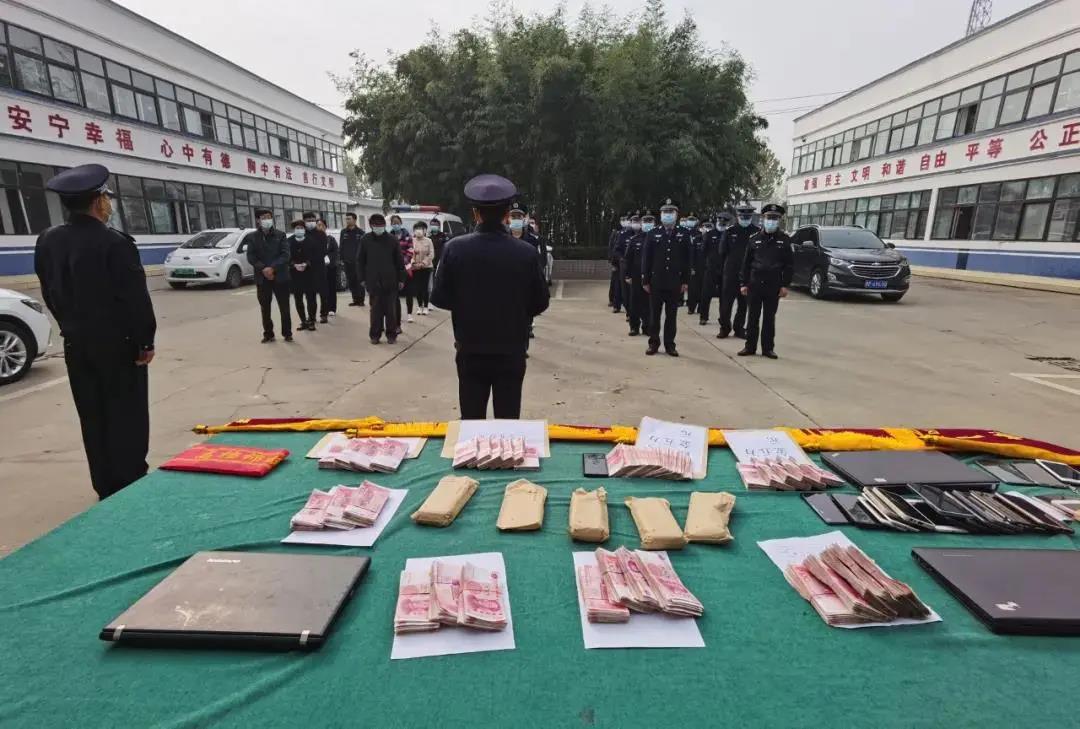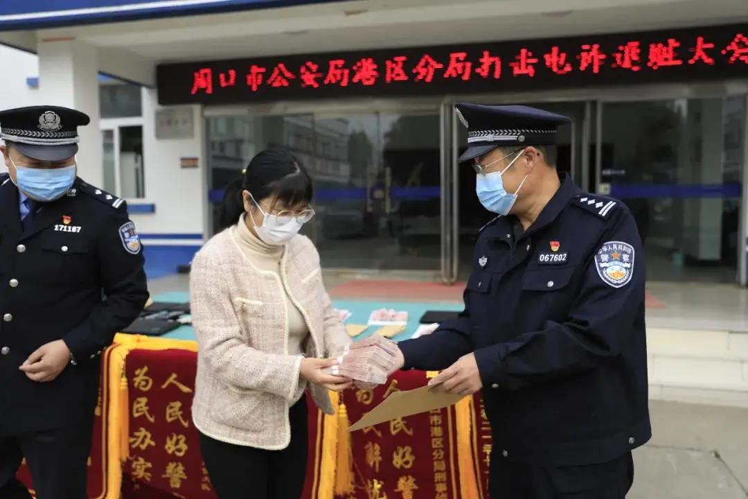 11月16日,周口市公安局港口物流产业聚集区分局召开电信诈骗案集中退赃大会,现场将追回的21万元赃款分别退还给4名受害人。