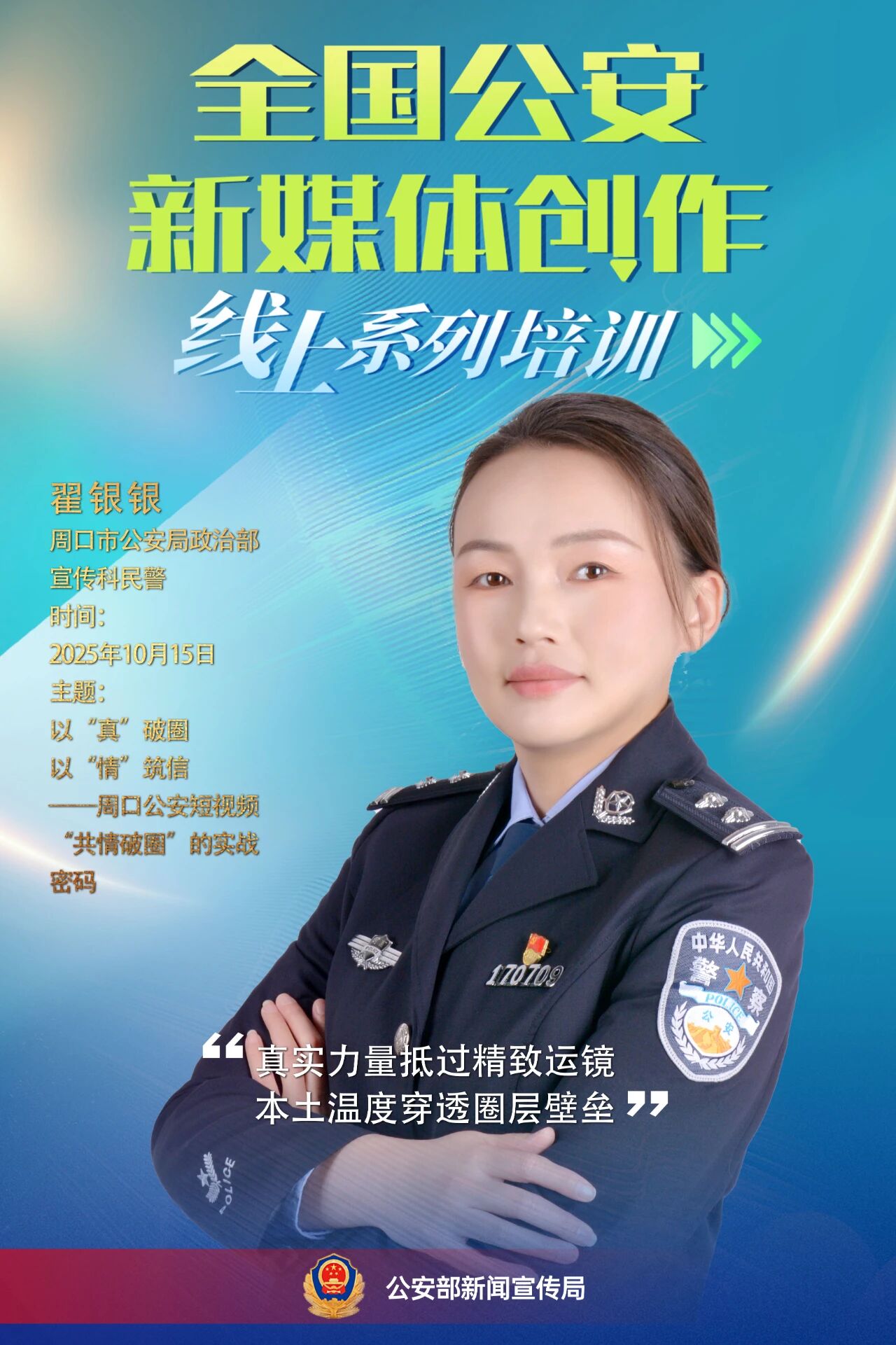 近日,市公安局政治部新闻宣传科民警翟银银以《以真破圈以情筑信——河南周口公安短视频“共情破圈”实战密码》为主题,代表全省为全国公安机关新闻宣传部门民警进行公安新媒体创作线上专题授课。