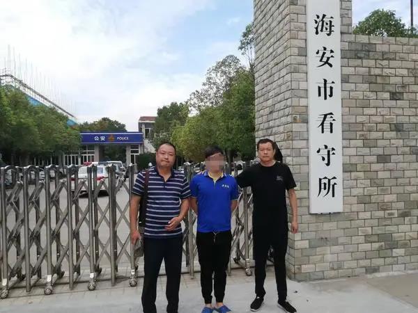 唐国旗(右一)与同事在海安抓获犯罪嫌疑人