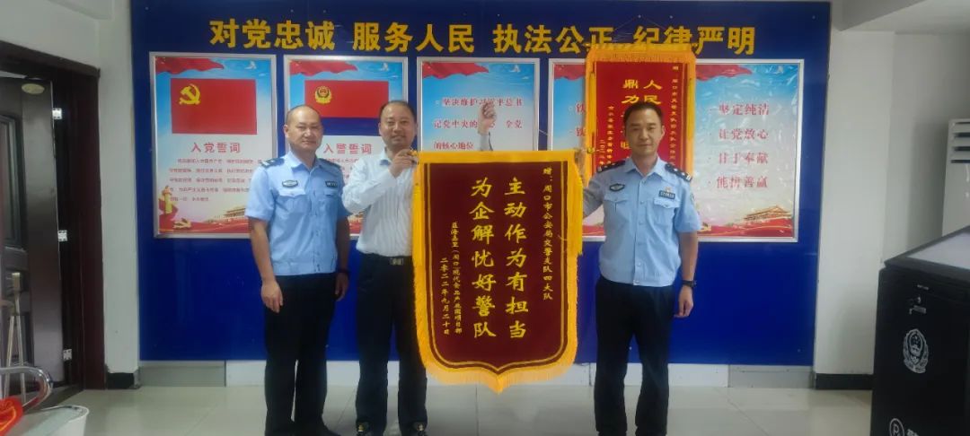 “真是太感谢你们了!为我们企业解决了停车的大难题。”9月20日上午,益海嘉里周口施工项目负责人握住周口交警支队四大队大队长赵明的手动情的说,并将一面写有“主动作为有担当 为企解忧好警队”的锦旗送到交警支队四大队。