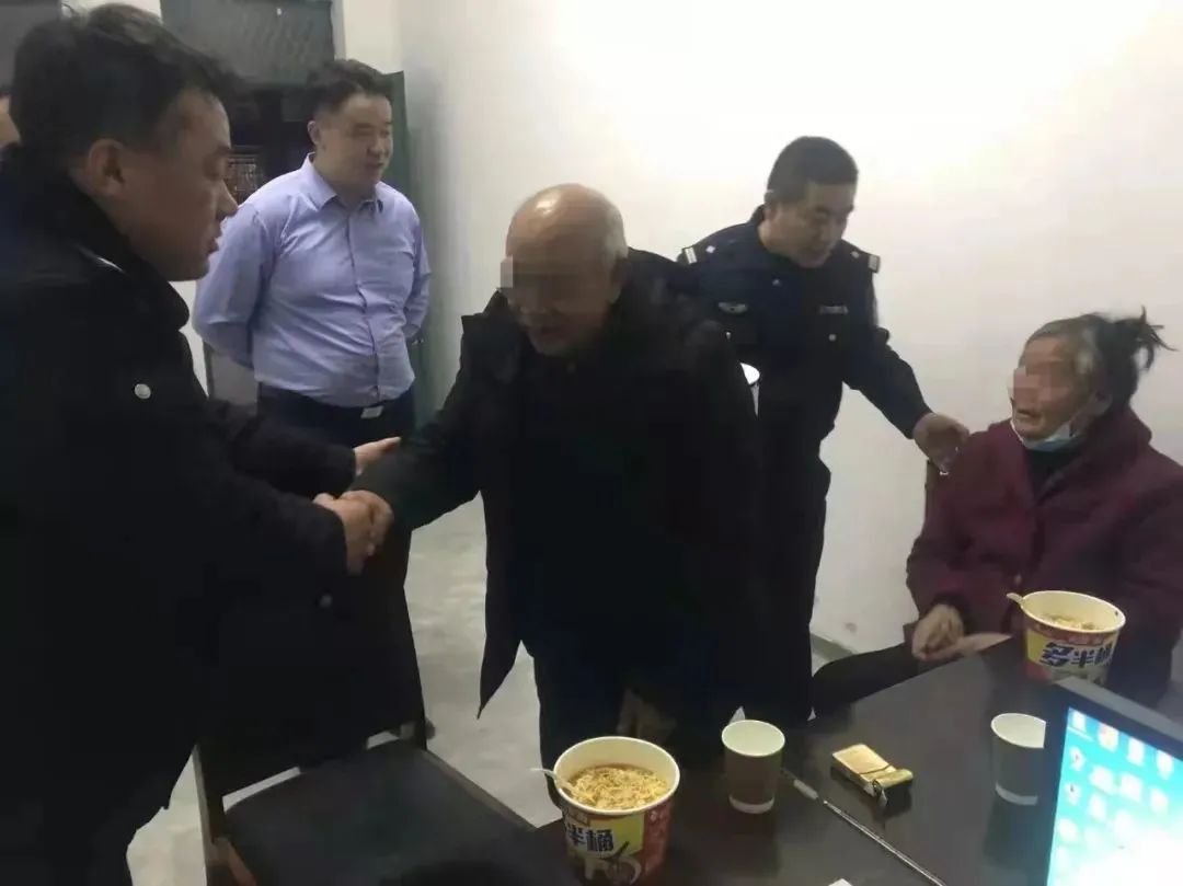 由于夜间天气寒冷,担心老人在外受冻,民警用警车将老人接到派出所取暖休息并为他们送上热水和方便面。