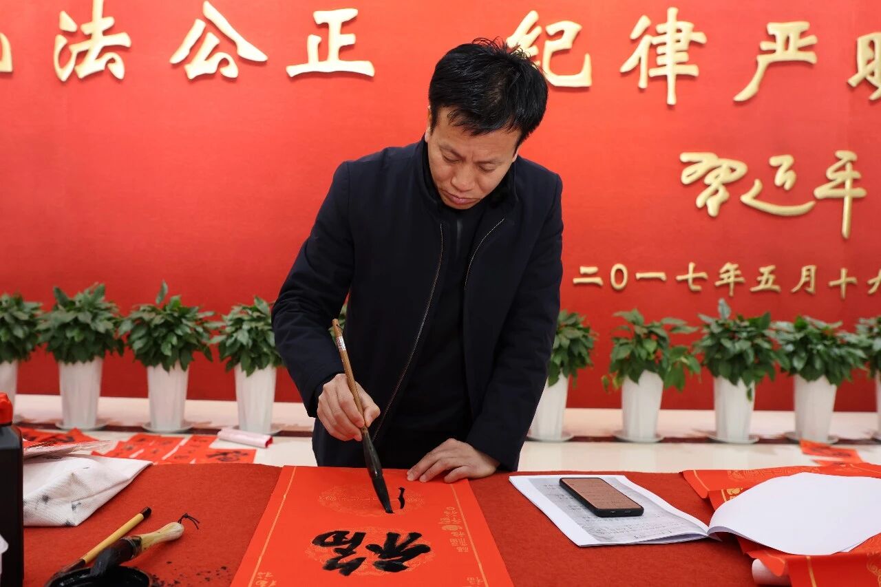 活动现场,红纸铺陈,墨香沁人。书法家们凝神静气、挥毫落纸,笔走龙蛇间尽显笔墨神韵。“福”字饱满遒劲,蕴藏平安之愿;春联对仗工整,表达公安担当。“砺剑铸魂做忠诚铁军,策马扬鞭护三川平安”彰显为民初心,“警徽闪耀映初心,骏马奔腾展宏图”映照奋进之志,“骏马踏春开盛景,盛世腾龙岁月新”定格时代气象……一幅幅蕴含马年寓意、彰显公安本色的春联陆续诞生,红纸黑字间流淌着浓浓的年味与深深的警魂。警营书法爱好者们虚心求教,在名家指点下提笔实践,于点横撇捺间体悟传统文化魅力,传承笔墨精神。书写现场气氛热烈,大家一边欣赏书法创作,一边挑选心仪的联句,或协助铺纸研墨,或悉心晾晒佳作,暖意融融间尽显“警营如家”的温情。
