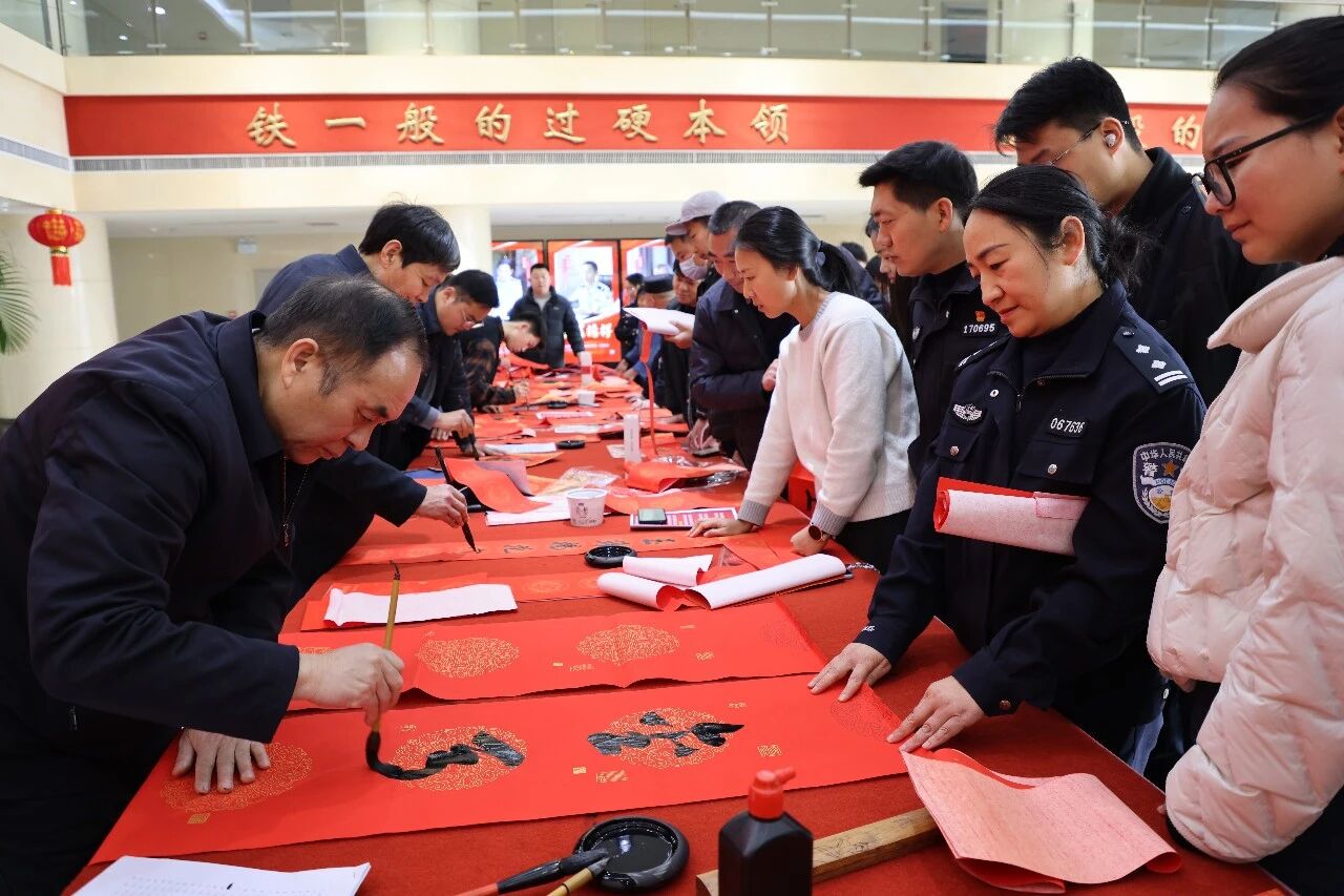 骐骥驰骋迎祥瑞 翰墨送福润警营。在新春佳节即将来临之际,为丰富警营文化生活,弘扬中华优秀传统文化,凝聚警心、鼓舞士气,2月12日上午,周口市书法家协会2026年新春公益活动走进周口市公安局,为民辅警写春联、送祝福。河南省书协副主席、周口市书协主席李珂携市书协副主席李为、何岩、陈涛、薛永信等14人;市公安局轩敬贤、王安林、邓敏、李娜、李佩佩等警营书法爱好者在现场挥毫泼墨,为民辅警义写春联,送上浓浓的新年祝福。