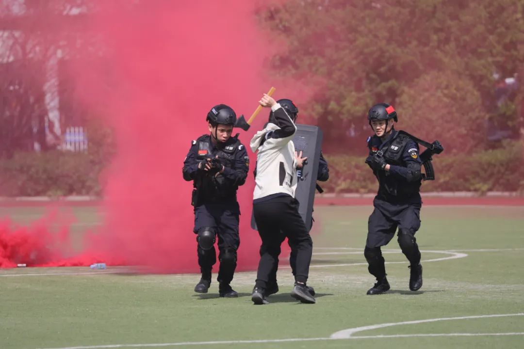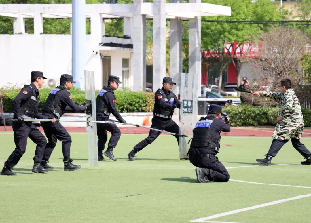 演练伊始,作战小组战术动作和应急棍术科目率先登场。队员们身着防弹衣,手持应急棍,眼神如鹰般锐利。随着指挥官的一声令下,他们迅速变换阵型,时而呈三角进攻队形,时而转为防御方阵。棍影交错间,攻防转换行云流水,配合有序,每一个劈、扫、戳的动作都虎虎生风,展现出强大的威慑力。
